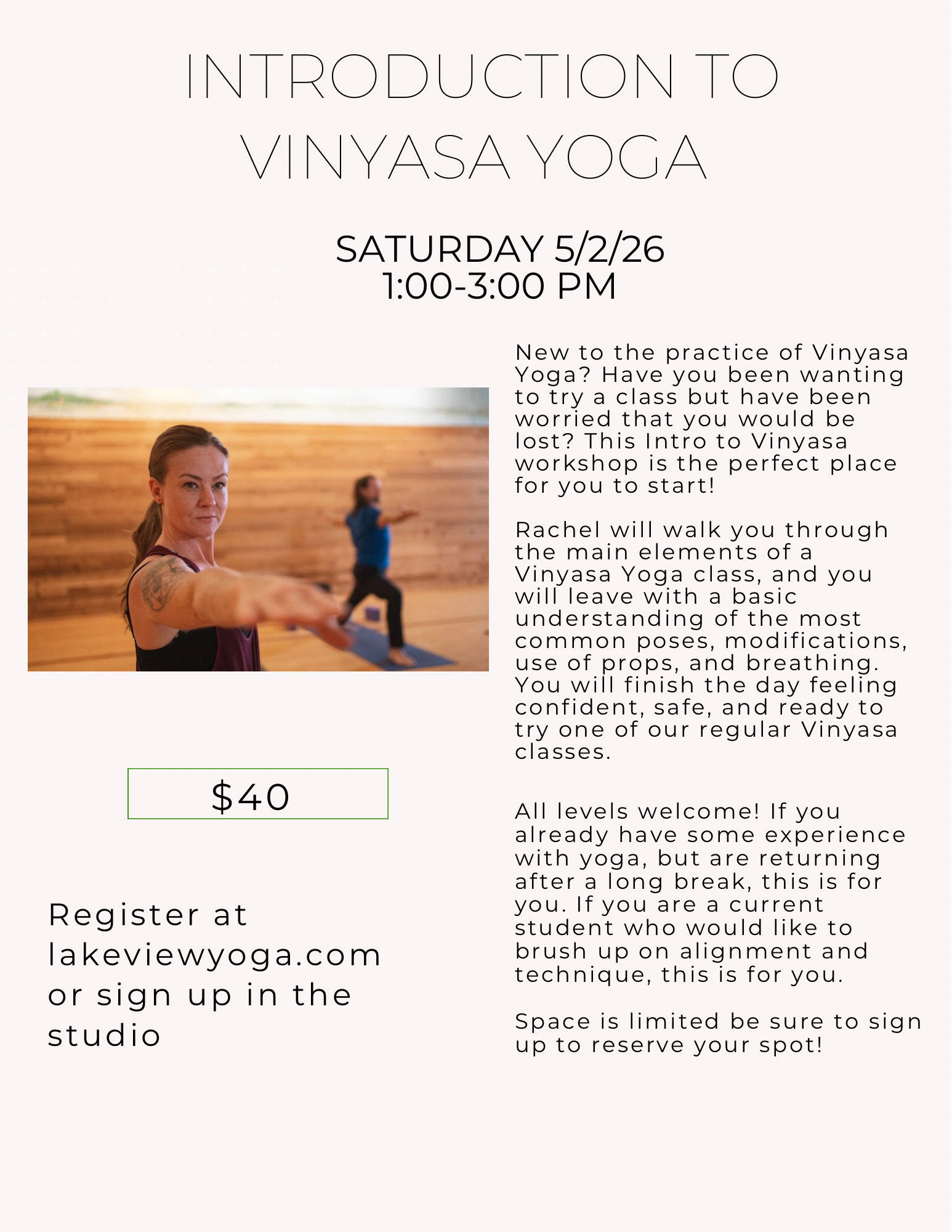 If you already have some experience with yoga, but are returning after a long break, this is for you. If you are a current student who would like to brush up on alignment and technique, this is for you. If you have never tried Vinyasa yoga and want to take the anxiety out of your first class, this is for you.